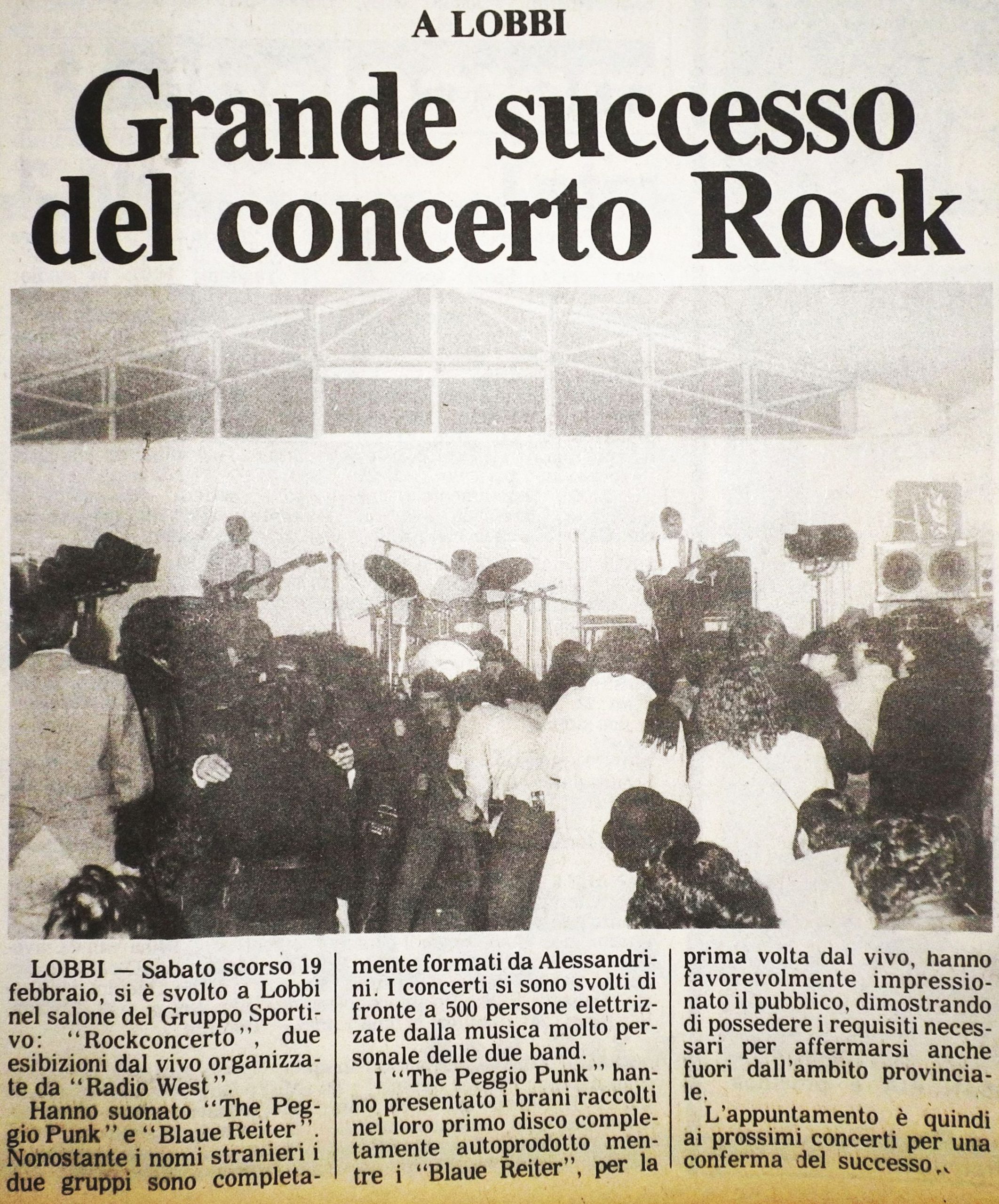 Il primo concerto organizzato da Radio West, all’insegna della musica alternativa: il punk dei Peggio e la new wave dei Blaue Reiter, due gruppi locali ma molto amati anche fuori provincia. Ed è subito un successo: in un salone dalla capienza di 300 persone si ammassano 500 ragazzi. A sette mesi dall’apertura, la stampa locale per la prima volta si accorge di Radio West.